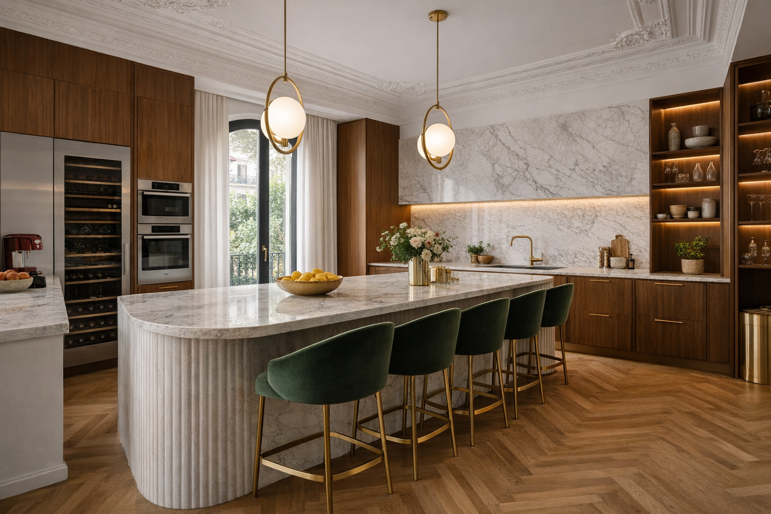 A study in material balance — marble, timber and brass come together in a kitchen that feels both refined and effortlessly functional.