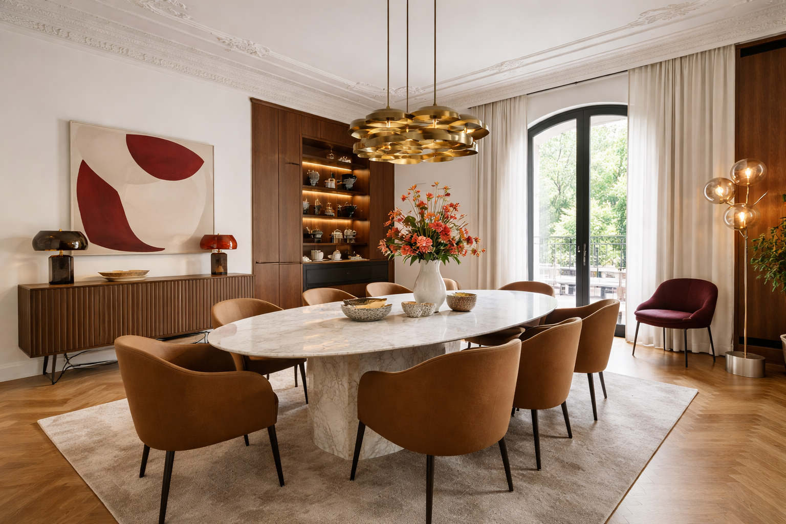 Sculptural and grounded, the dining room pairs marble, timber and leather to bring warmth and quiet sophistication to everyday gathering.