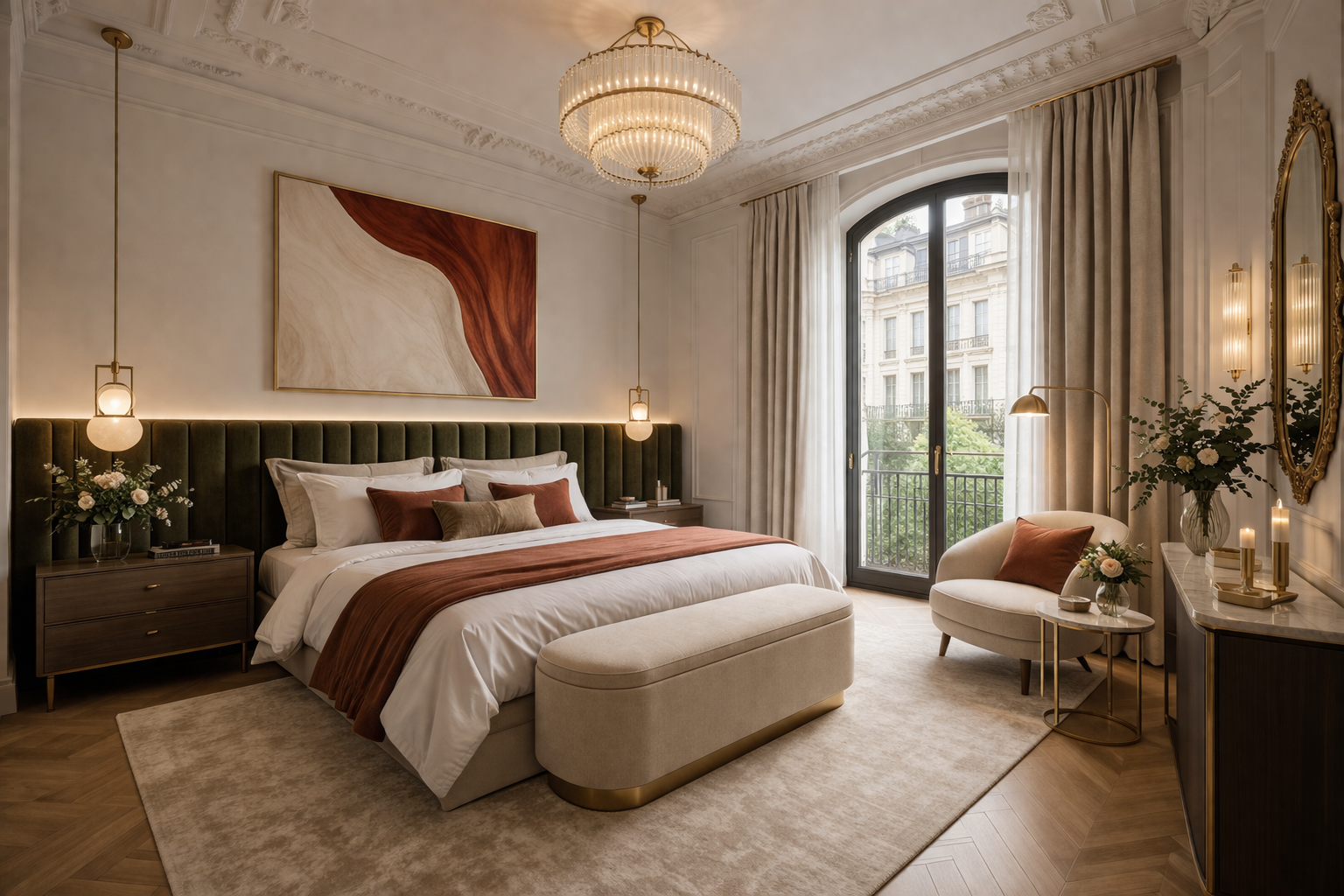 A more intimate interpretation of the palette, layering deeper tones and tailored finishes for a cocooned, quietly luxurious feel.