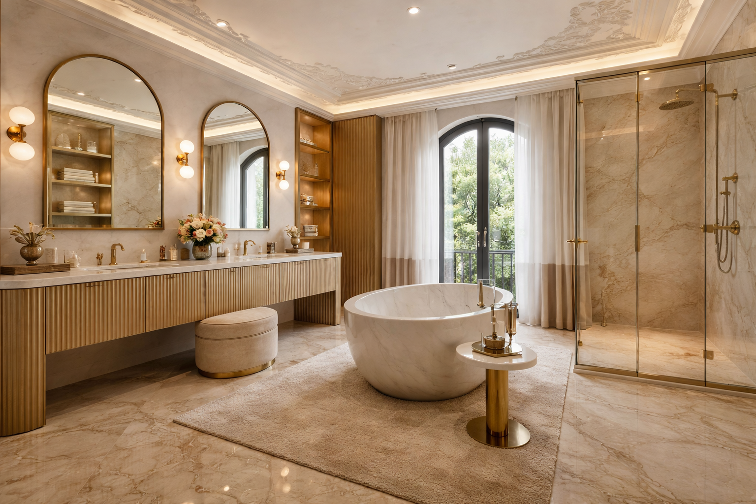 Marble, brass and timber resolve into a bathroom that feels timeless and considered — designed for daily rituals, not just display.