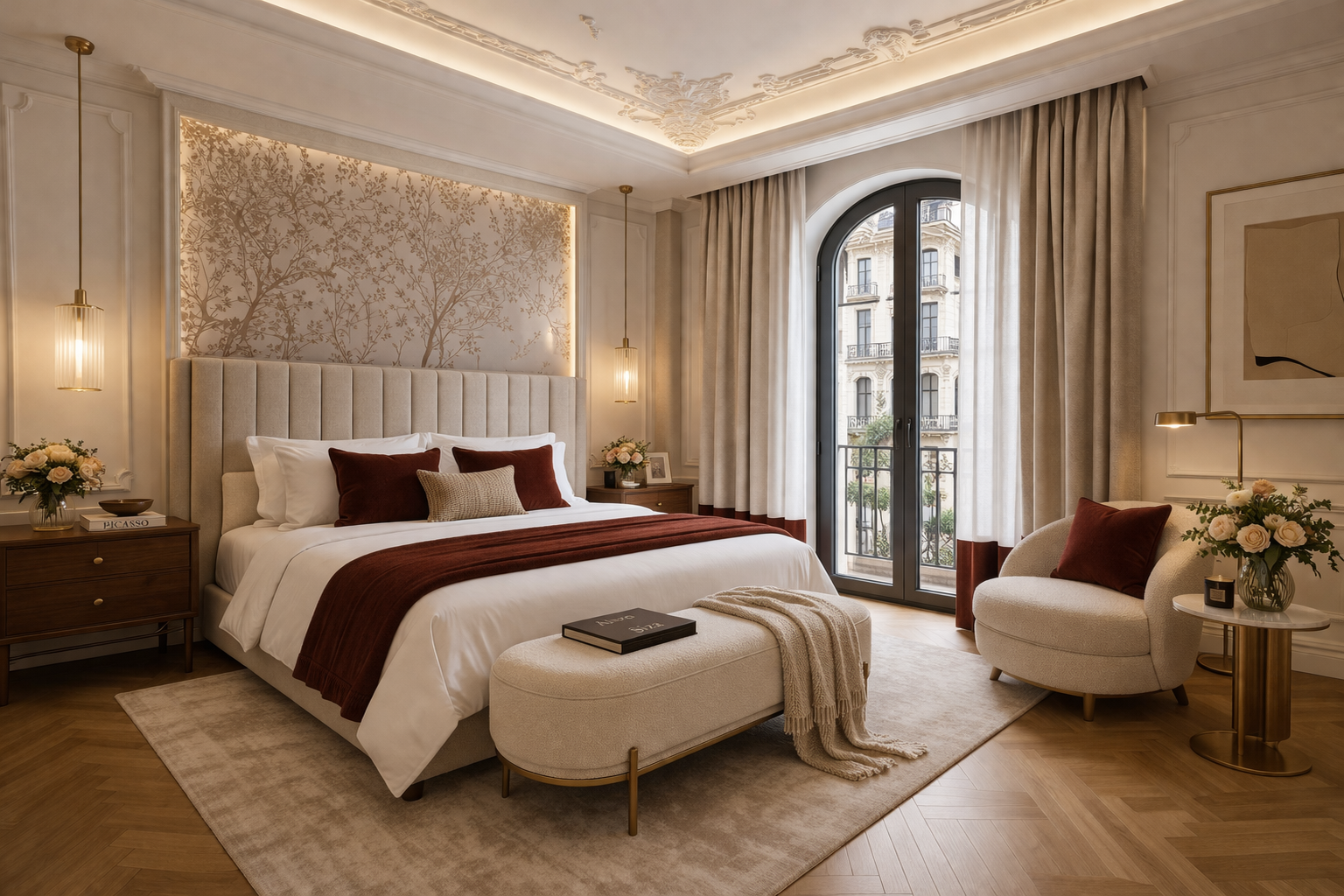 A softly layered living space where curved forms, warm neutrals and natural light create a sense of ease within a classic Madrid setting.