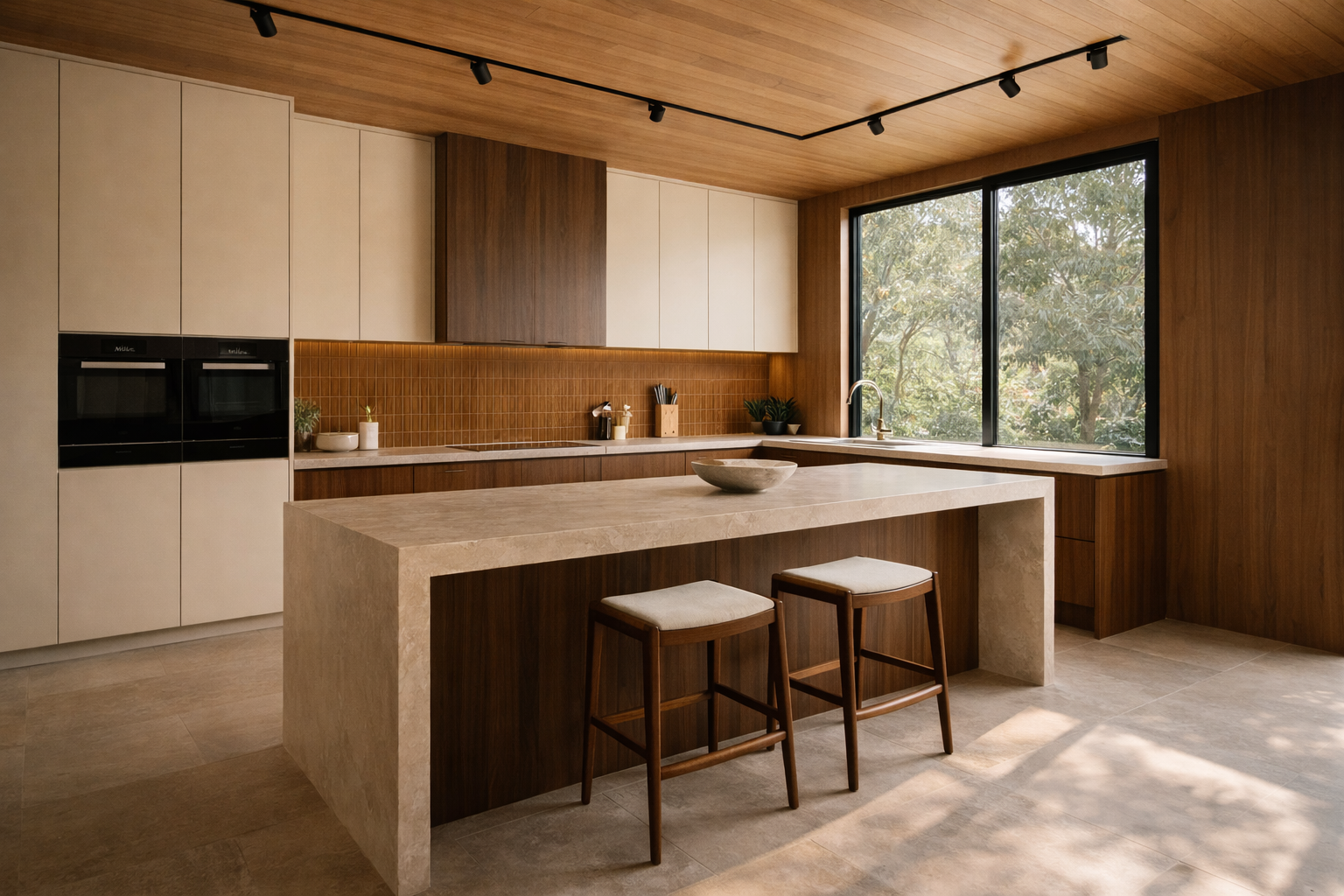 The kitchen continues this language with quiet confidence. A monolithic travertine island sits at its centre, solid and tactile, balanced by finely detailed timber joinery and a restrained use of cream cabinetry. The palette is warm, but never heavy. Light moves easily through the space, catching the subtle variation in the stone and the grain of the timber.