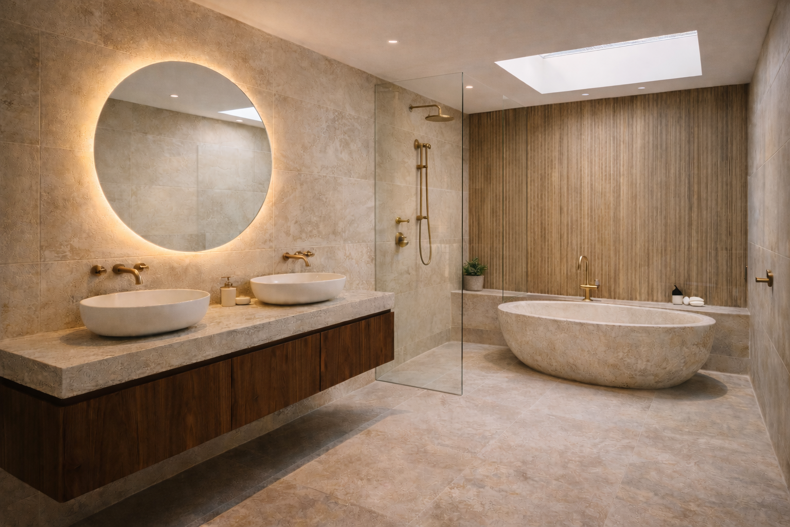 Stone surfaces, timber detailing, and brushed metal fixtures create a space that feels grounded and enduring. A freestanding bath, positioned with intention, becomes less of a statement and more of a place to pause.