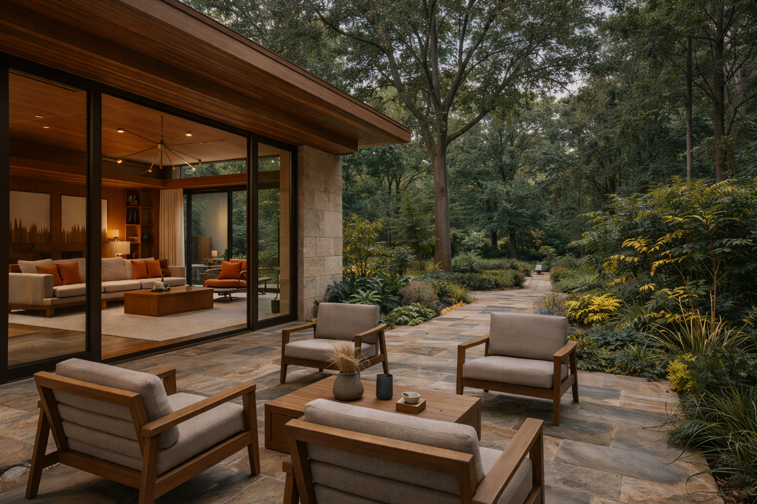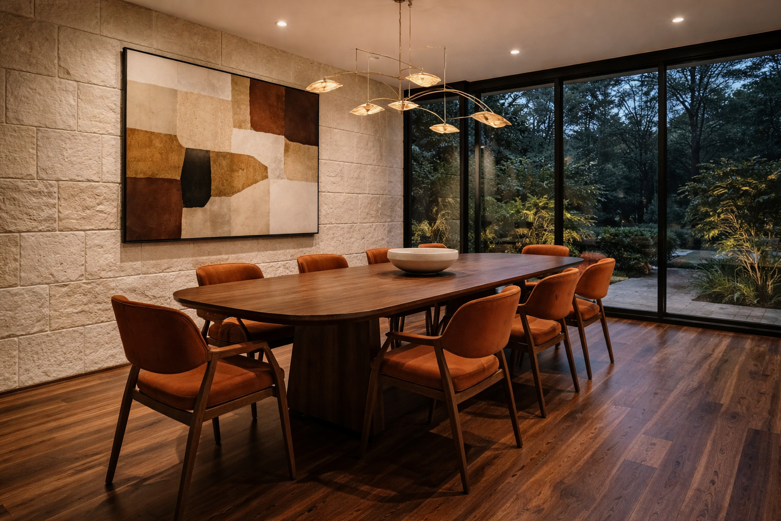 A composition of timber, stone and clean lines — where mid-century principles are expressed through structure, proportion and material honesty.