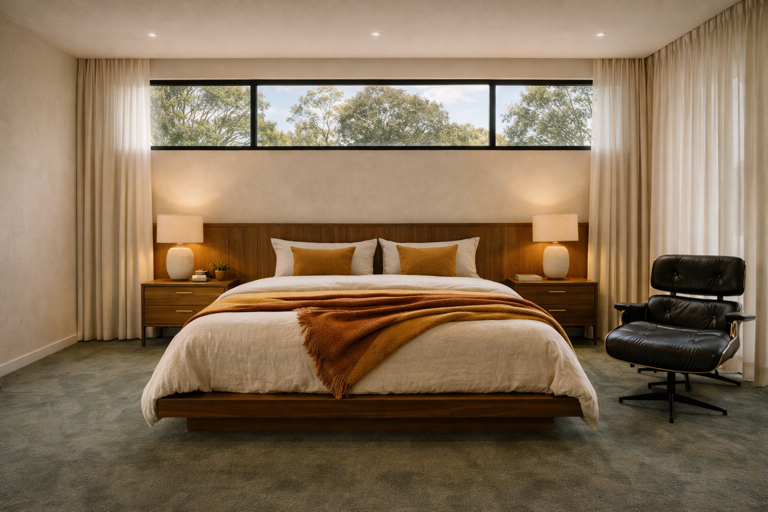 The private spaces shift again — not in language, but in mood. In the bedroom, the palette softens to a more muted composition of cream, timber and warm neutrals. A low platform bed sits beneath a horizontal window line, reinforcing the home’s connection to the landscape. The addition of deeper tones — a throw, a cushion — is enough to bring depth without disrupting the calm.