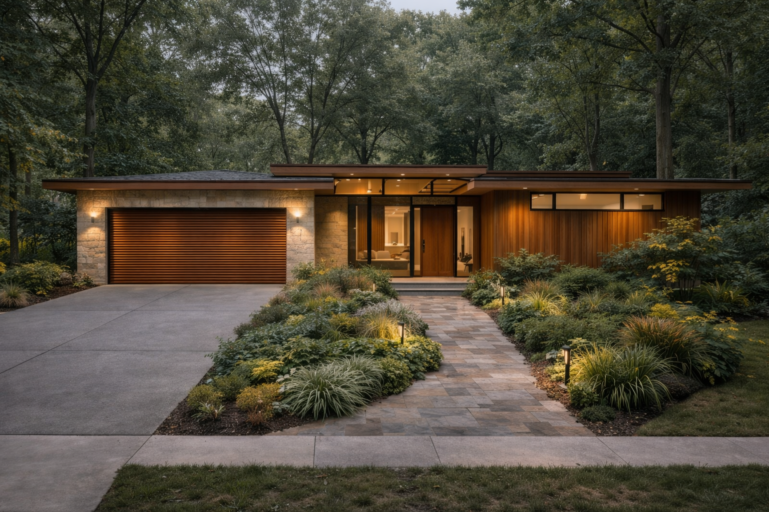 From the outset, the material palette sets the tone. Timber, stone and glass are used with restraint — not as features, but as foundations. A slatted timber garage door sits comfortably alongside stonework and vertical cladding, while the low, horizontal roofline reinforces that unmistakable mid-century clarity.