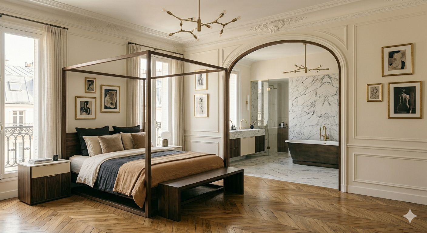 The bedroom is anchored by a simple four-poster form, chosen for its clarity rather than decoration. Beyond, the ensuite reads as a continuation—an opening rather than a separate space—linking the two through material