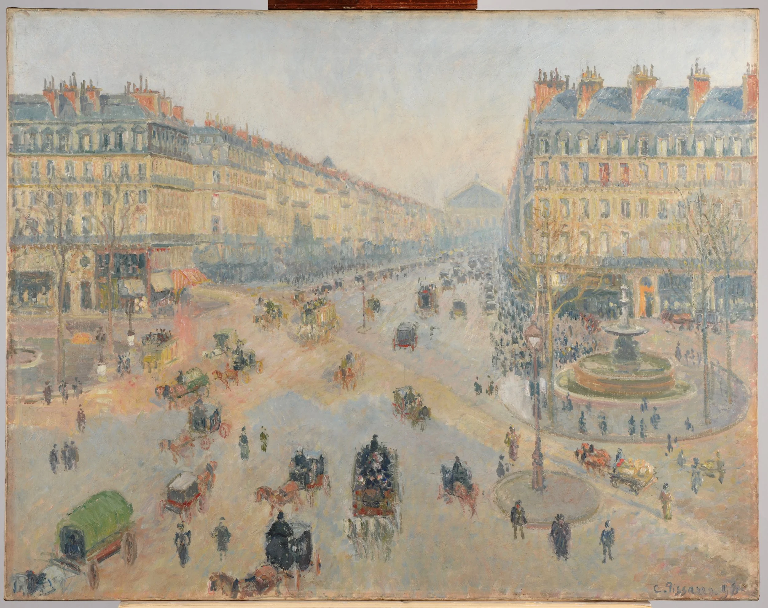 Napoleon III instructed Haussmann to bring air and light to the centre of Paris, to unify the different neighbourhoods with boulevards, and to make Paris more beautiful. The Avenue de l'Opéra, created by Haussmann, painted by Camille Pissarro, 1898.