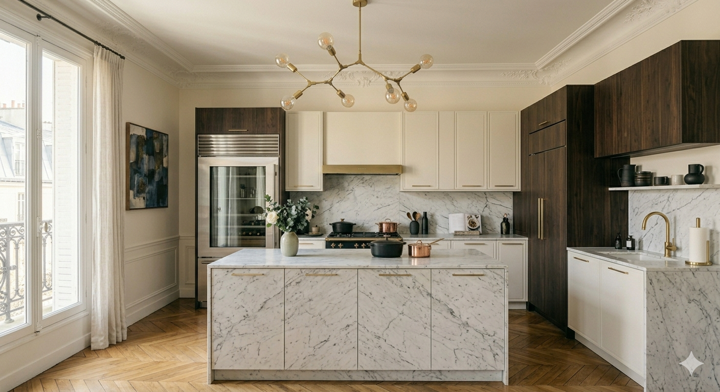 This is where the balance becomes more apparent. Classic Parisian elements sit alongside more relaxed, sculptural pieces—timber, boucle, and deep upholstery—bringing a sense of ease to what could otherwise feel overly composed.