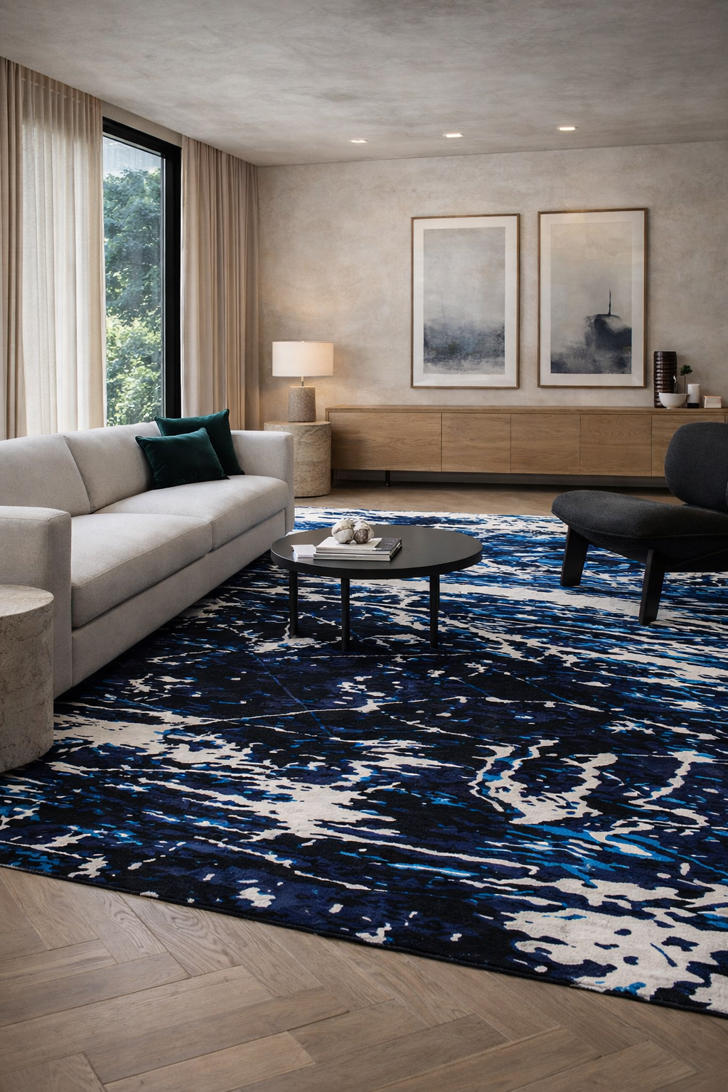 Anchored by Scratches Indigo, a rug from the St James Whitting collection, the space draws energy from its inky blues — bringing movement and contrast to an otherwise restrained interior.