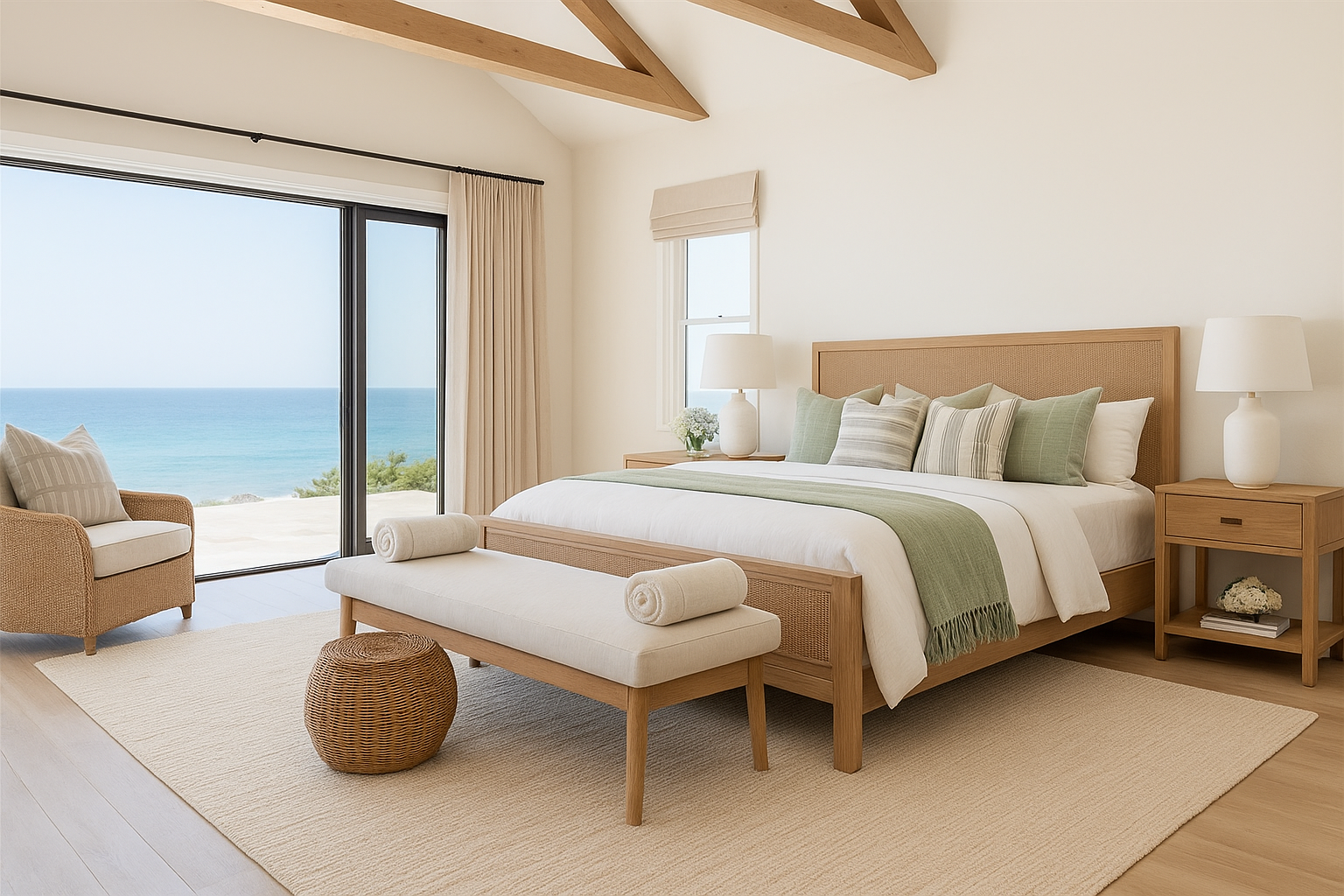 A palette of sand, timber and soft green creates a sense of quiet permanence — where natural materials and restrained colour allow the space to settle gently into its coastal setting.