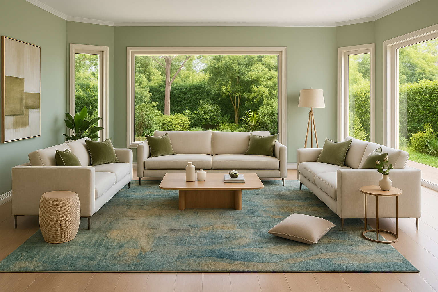 The room is anchored by Coastal Patina, a rug of my own design, whose layered greens and softened blues echo the surrounding landscape, reinforcing a connection between the interior and the garden beyond.